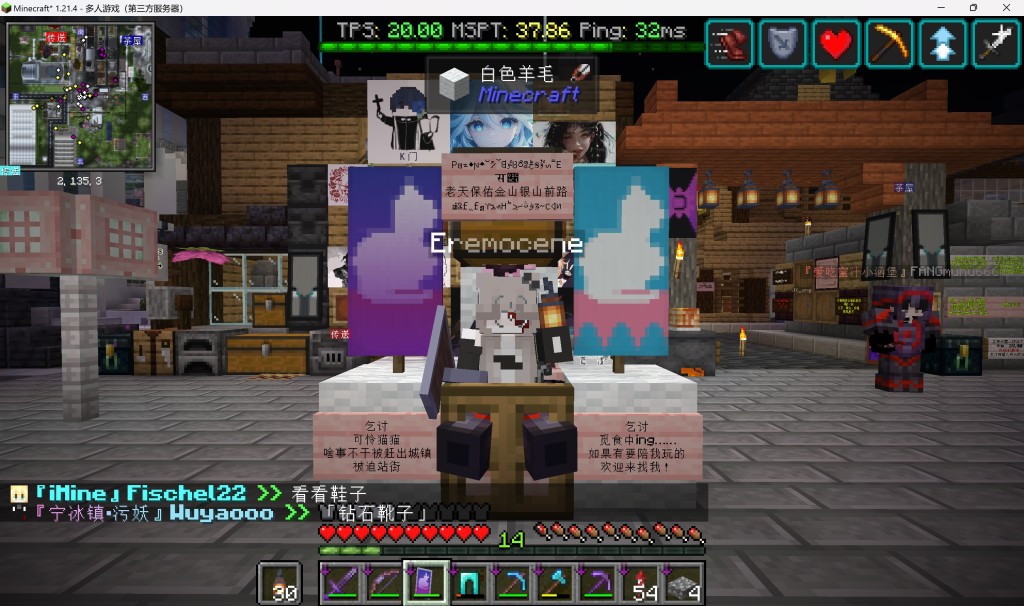 九周目刚开的时候,我来到了ICT。这是我玩的第一个服务器。刚进来就被漂浮木棍打飞到牌坊上不敢下来,之后又被人坐在头顶表白不知道怎么让他下来,摆脱不了急得我原地下线。这个服务器实在是太危险了,重新上线之后我决定赶紧找一个一起玩的伙伴来保护自己。