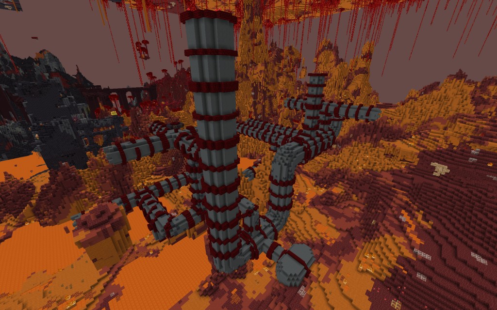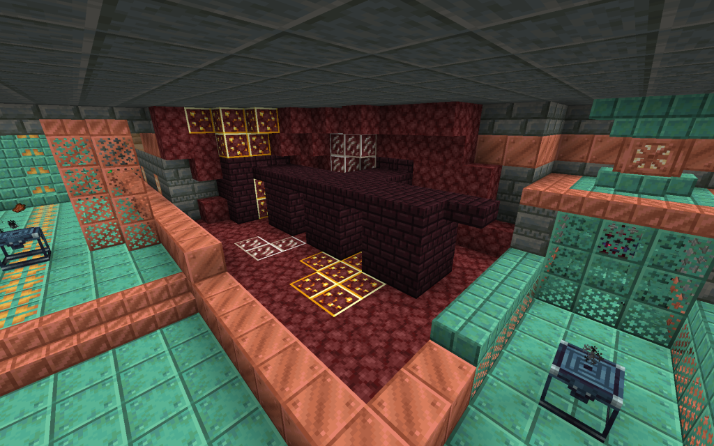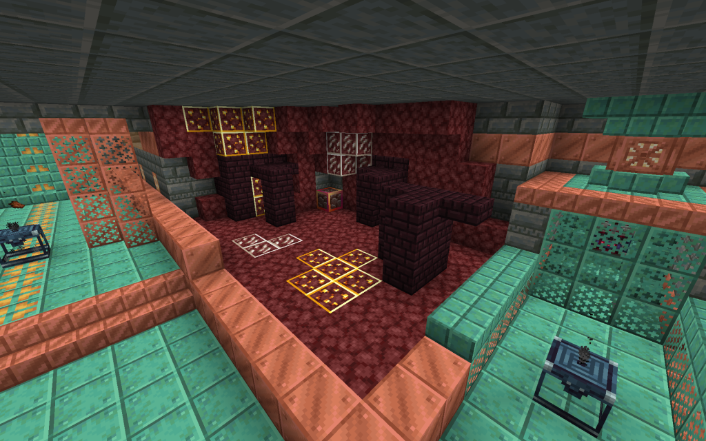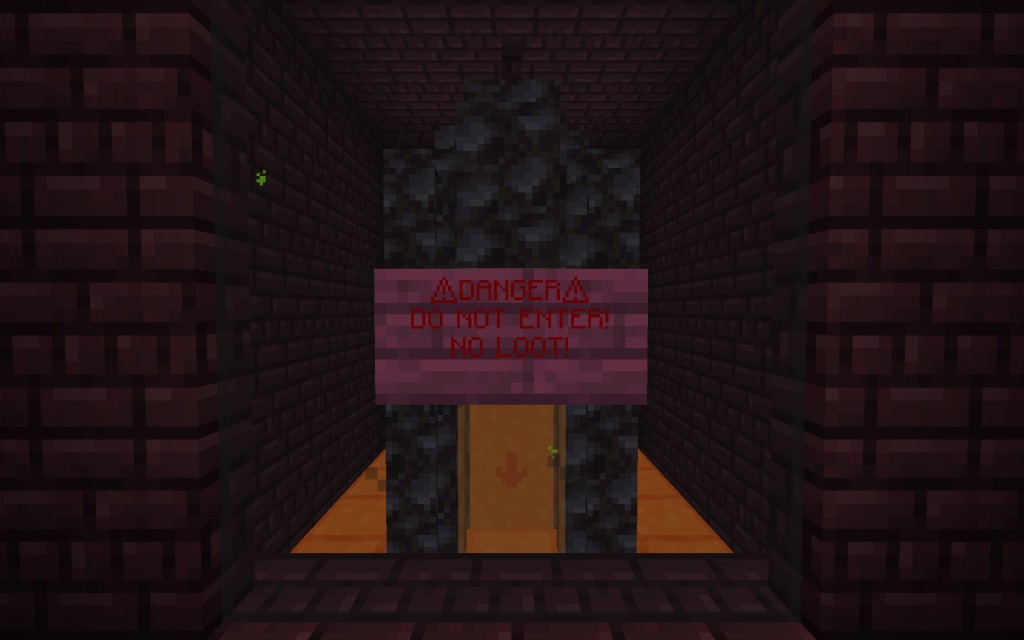除此之外,在控制室的内部,在与另一根管道连接的岩浆房间中,在写着“危险 不要进入!没有战利品!”(你猜我信不信)的告示牌后方,有一个木桶藏在岩浆之中,其中必定会生成一个远古残骸或下界合金碎片