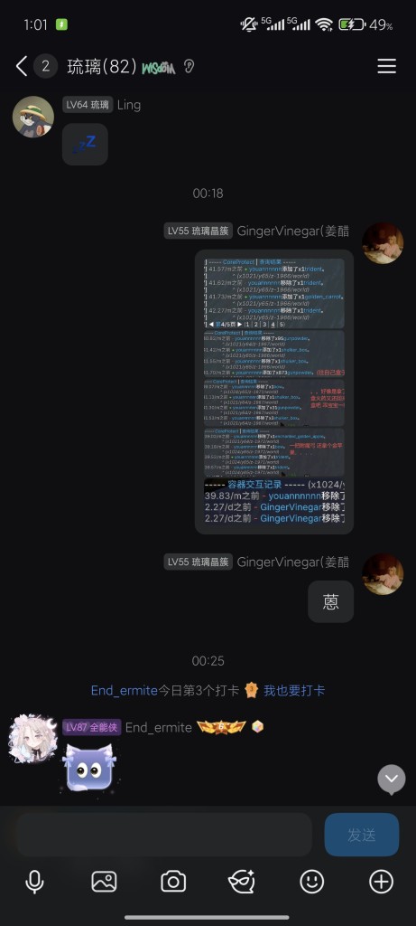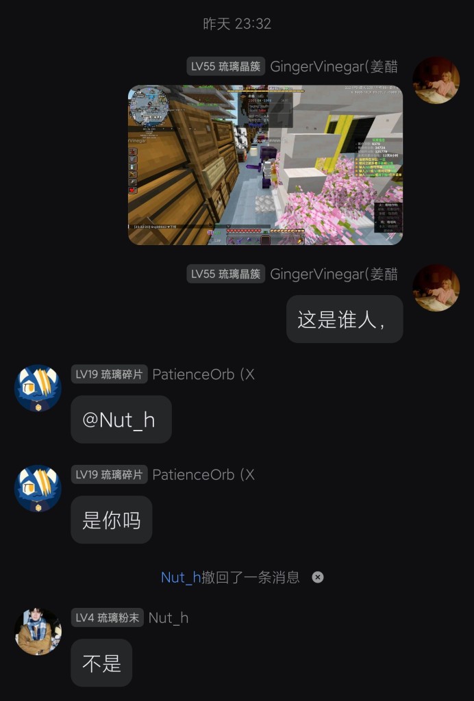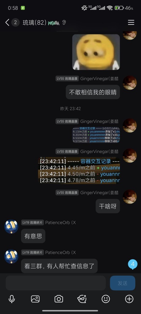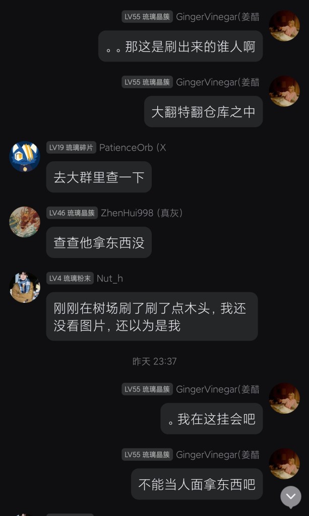 时值2025年10月10日东八区北京时间23时前后,琉璃老奶(化名)自商店上货归来,欲将背包中不知何处得来之四块散沙置入仓库箱中后美美入睡。正开箱而挂机于箱子页面调节网易云音乐之时,奶闻附近有潜影盒不停开合之声。循声寻去,竟是一未曾相识之人正大翻仓库之箱。老奶不以为意,只当此人系旅游观光他乡来客,只为检索琉璃仓库之物华天宝,然心有余虑,乃截图设问于琉璃QQ群中曰: