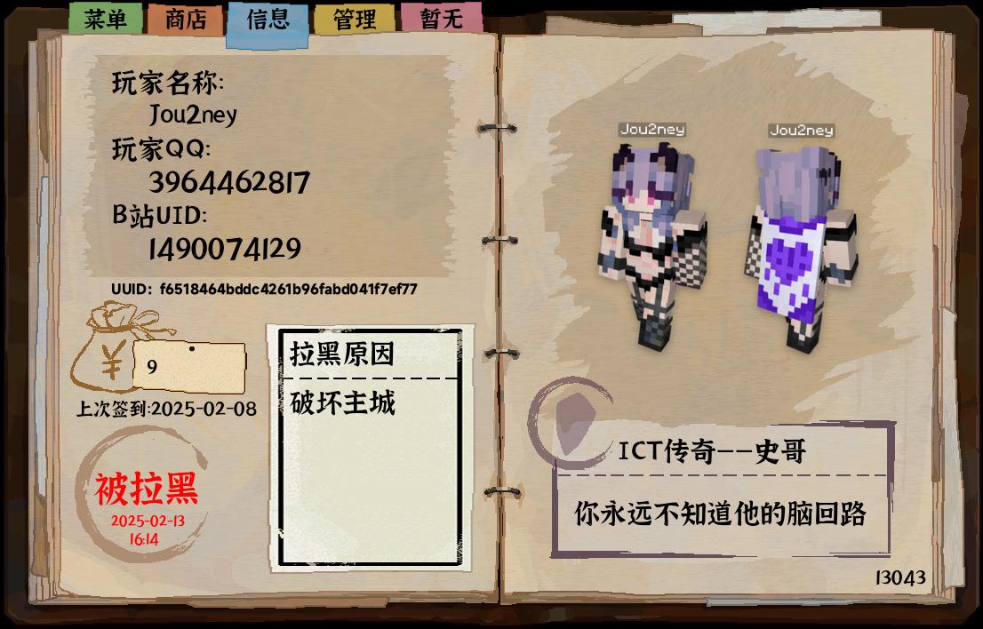 无敌暴龙兽 对于史哥,一开始我还没怎么注意,只当是小萌新跟我抱团发展的罢了 你问我为什么留着史哥qq,因为忘删了。等级这么低可能是他小号,所以史哥可能一直在我们身边 在我这里时,他没弄坏机器也没拆家,却是有暴露癖,脱下皮肤外套给别人看…(不好说) 我自然没这待遇,是有受害者反馈的 后来也是大家熟悉的史哥 当时服务器维护更新,对于染上ict的史哥(可能是想满足他的暴露癖)离开了ict就要死了一样,在大群里连问5次“服务器什么时候开” 这是大部分人第一次见识到史哥 当服务器开后听说他脑神经连通,去炸了主城... 这么的奇自然逃不过小麦的铁拳,当然是迎接永久大礼包了。
